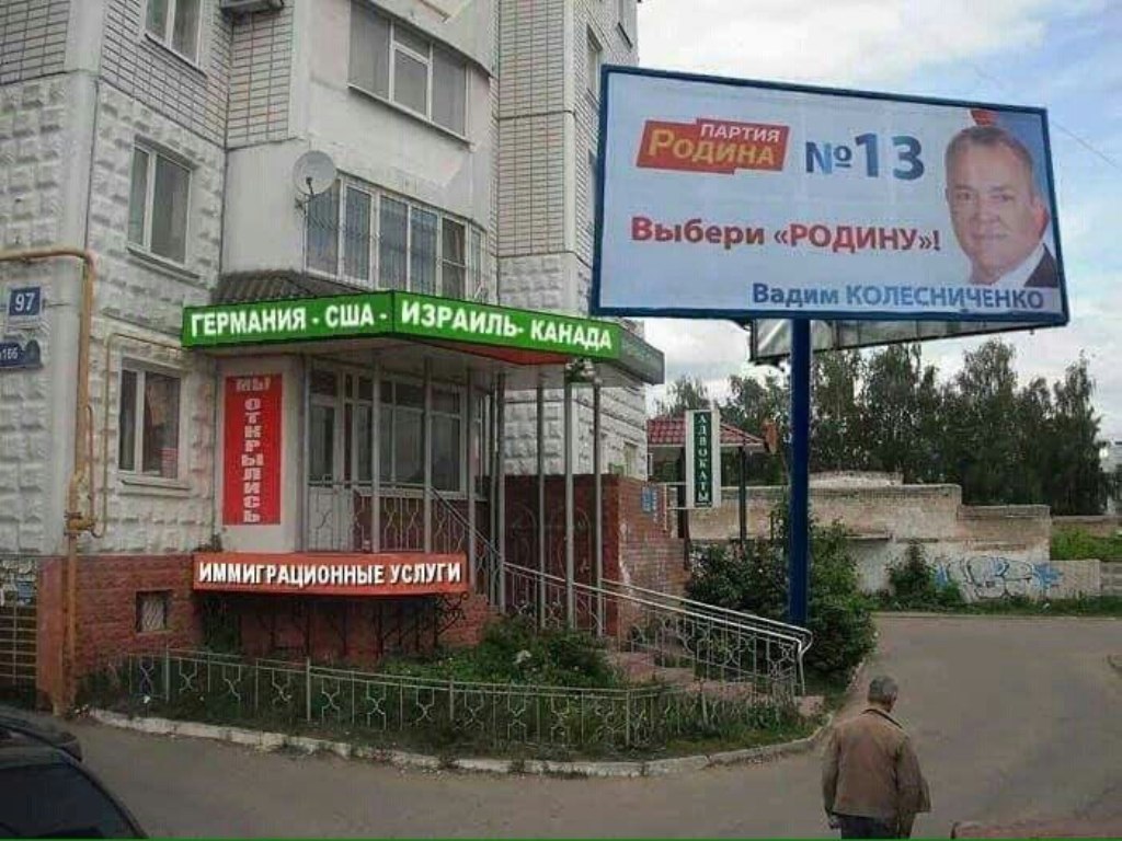 Вадим Колесниченко (к слову, экс-депутат Верховной Рады Украины) разместил свою агитацию рядом с центром по оформлению виз и продаже путевок за рубеж. «Выбери Родину!» значится на его баннере. На рекламной конструкции по соседству – «Иммиграционные услуги. Германия, США, Израиль, Канада».