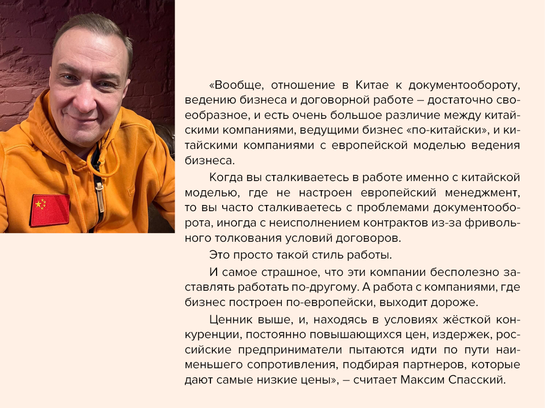 , что многие российские предприниматели не всегда осознают специфику ведения бизнеса с китайскими компаниями. И иногда данные в экспортной таможенной декларации могут просто не совпадать с контрактом даже не потому, что представители китайской стороны включили в стоимость, например, услуги дизайна, а потому, что исполнитель мог, к примеру, просто заполнить документ для одной компании с данными для другой.