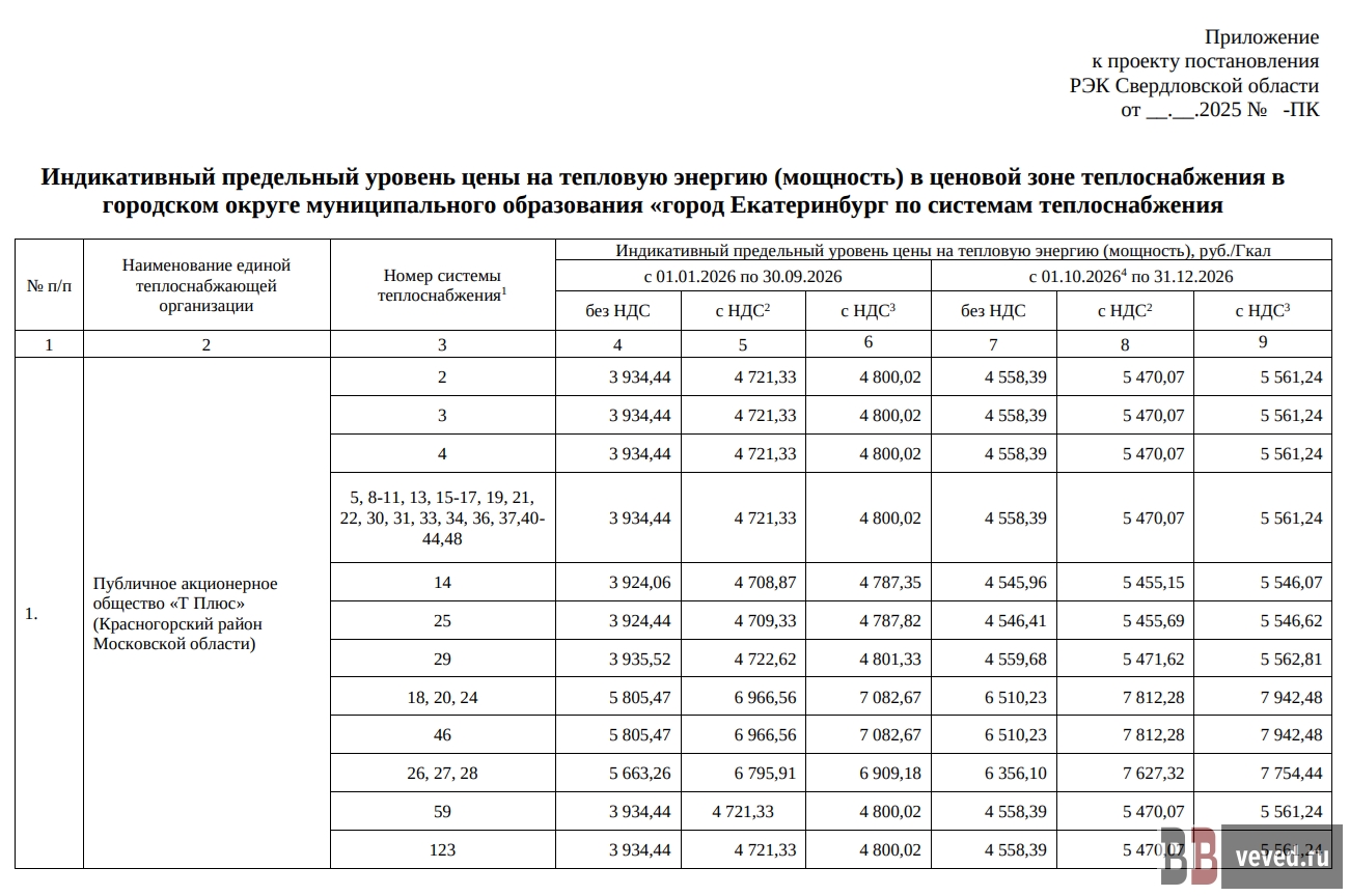 Согласно проекту постановления Региональной энергетической комиссии (РЭК) «Об утверждении индикативного предельного уровня цены на тепловую энергию», для районов, обслуживаемых ПАО «Т Плюс» и входящим в его структуру АО «Екатеринбургская теплосетевая компания», предельная стоимость тепла с 1 января 2026 года вырастет с 4 721 рубля 33 копеек за Гкал до 5 470 рублей 7 копеек. А поскольку федеральные власти со следующего года планируют ещё и увеличить НДС (с 20% до 22%), в проекте заложили стоимость с учётом увеличенной ставки налога на добавленную стоимость — 5561 рубль 24 копейки.