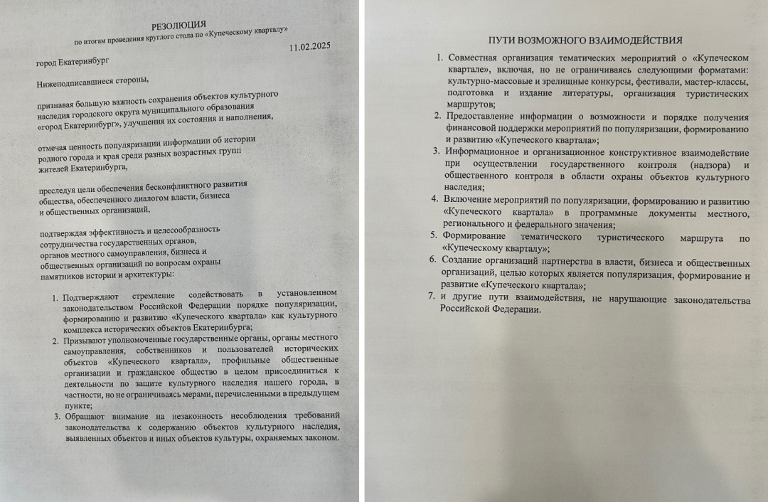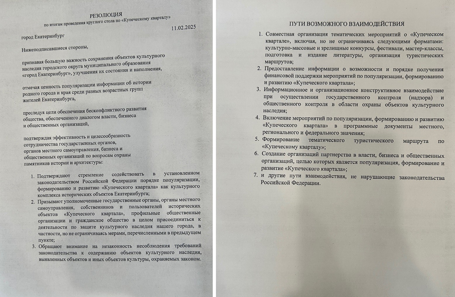 По итогам круглого стола его участники подписали резолюцию, в которой зафиксировали готовность участвовать в развитии «Купеческого квартала». Кроме того, в резолюции содержится призыв к государственным и муниципальным органам, а также профильным общественным организациям и просто неравнодушным людям присоединиться к деятельности по популяризации и сохранению культурного наследия Екатеринбурга. После мероприятия инициативная группа соберет все озвученные предложения и дополнит ими резолюцию.