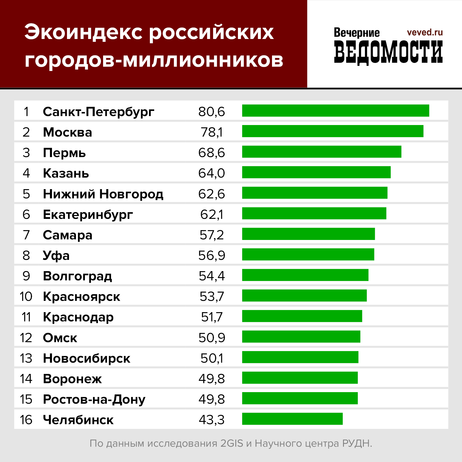 При этом в недавнем исследовании 2ГИС и Научного центра Smart Urban Nature Российского университета дружбы народов (РУДН), в котором анализировалась в первую очередь доступность парков и водоёмов, Екатеринбург занял не такое уж и низкое место среди городов-миллионников России: 6-е из 16-ти. Однако Пермь оказалась гораздо выше — уступив лишь двум столицам. «Большим открытием стала Пермь — в положительном ключе, и этот феномен требует дополнительного изучения, — прокомментировала Анастасия Константинова, кандидат социологических наук, научный сотрудник Научного центра Smart Urban Nature РУДН. — Стоит отметить, что в целом у Перми практически все оценки по объективным критериям находятся на уровне выше среднего, и при этом очень высокая субъективная оценка. Жители, судя по опросам, в целом довольны экологической обстановкой», — говорится в итогах исследования.