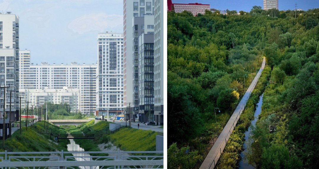 Пример искусственного (Екатеринбург, река Патрушиха) и естественного (Пермь, река Егошиха) коридоров долин рек. Коллаж: Владислав Постников