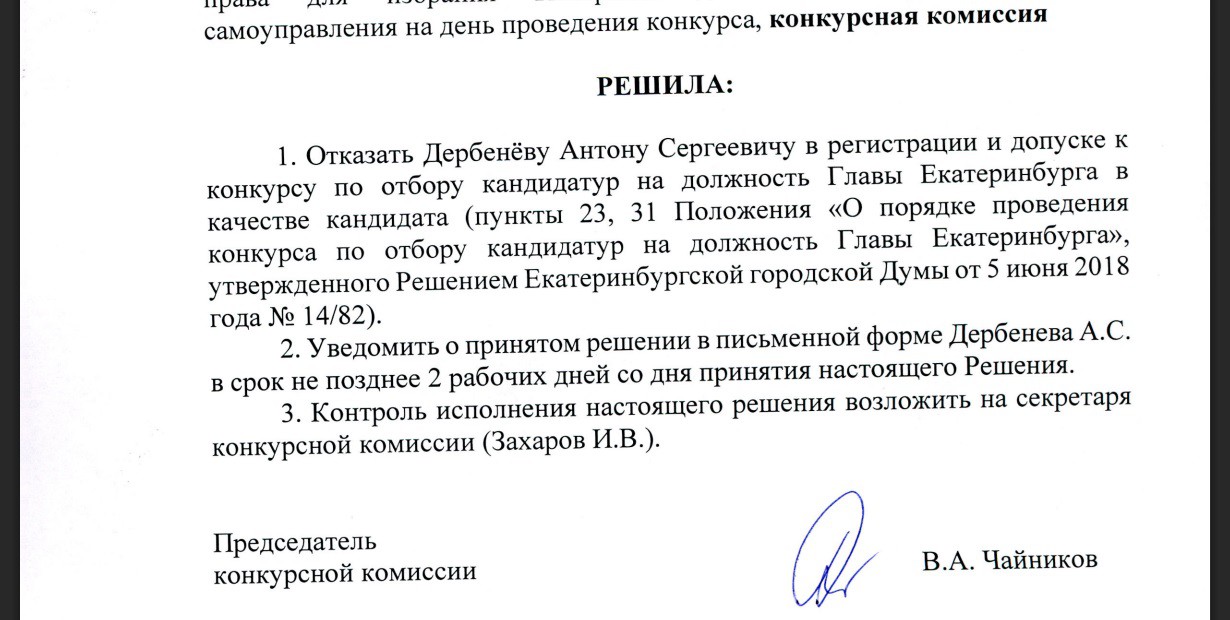 Конкурсная комиссия в 2018 году не допустила Дербенёва до голосования. Мэром тогда стал Александр Высокинский