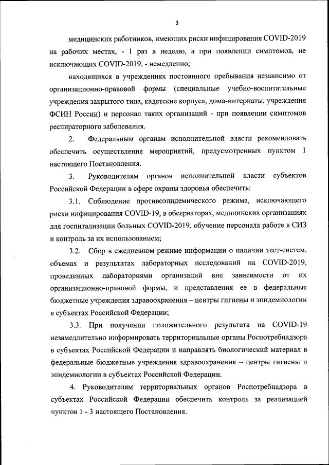 Обязательному тестированию на коронавирус также подлежат люди с внебольничной пневмонией, контактировавшие с зараженными, врачи с риском инфицирования COVID-2019 на рабочих местах и все находящиеся в учреждениях постоянного пребывания (специальные учреждения закрытого типа, кадетские корпуса, дома-интернаты, учреждения ФСИН) с симптомами респираторного заболевания.