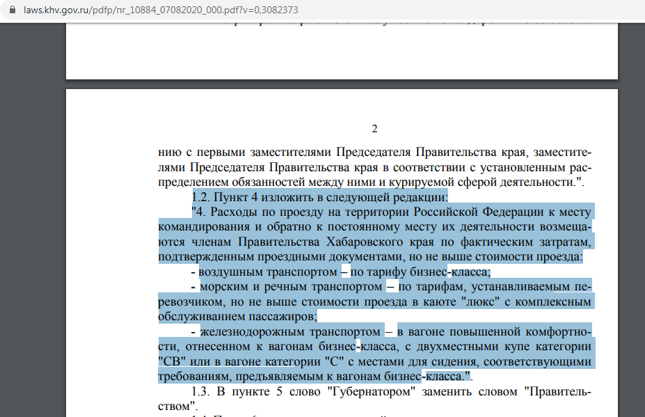 "4. Расходы по проезду на территории Российской Федерации к месту командирования и обратно к постоянному месту их деятельности возмещаются членам Правительства Хабаровского края по фактическим затратам, подтвержденным проездными документами, но не выше стоимости проезда:
