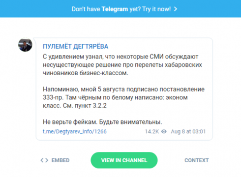 «С удивлением узнал, что некоторые СМИ обсуждают несуществующее решение про перелеты хабаровских чиновников бизнес-классом. Напоминаю, мной 5 августа подписано постановление 333-пр. Там чёрным по белому написано: эконом класс. См. пункт 3.2.2. Не верьте фейкам. Будьте внимательны», — пишет Дегтярев.