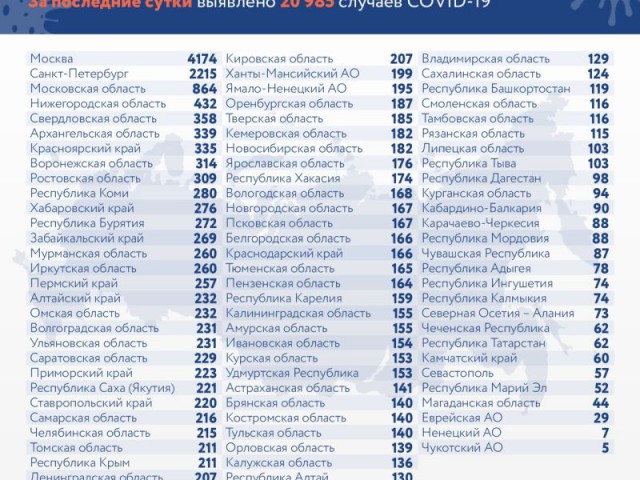 Также за сутки зафиксировано 456 летальных исходов. С начала эпидемии в России от коронавируса скончалось 34 387 человек. Мероприятие для возрастной категории 18+