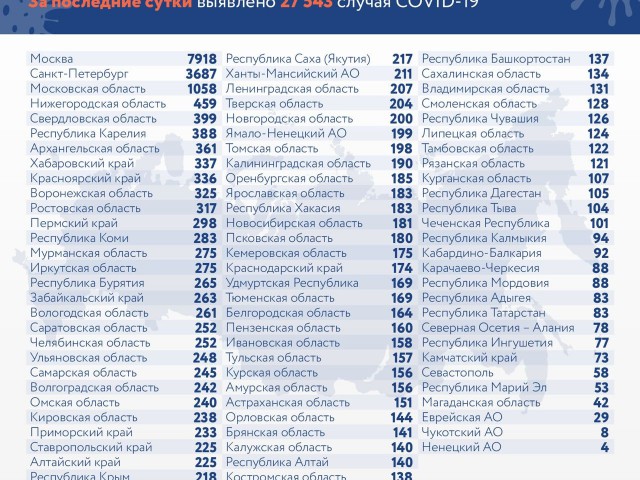 В России за последние сутки обнаружили еще 27 543 зараженных в 85 регионах. Также было зафиксировано 496 летальных исходов. Об этом сообщает федеральный оперштаб.