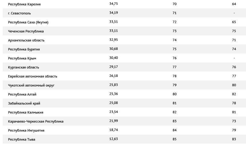 При этом Зауралье за год опустилось с 76-й позиции на 77-е место, оказавшись по соседству с Республикой Крым и Еврейской автономной областью. Лидеры – Москва, Санкт-Петербург и Московская область.